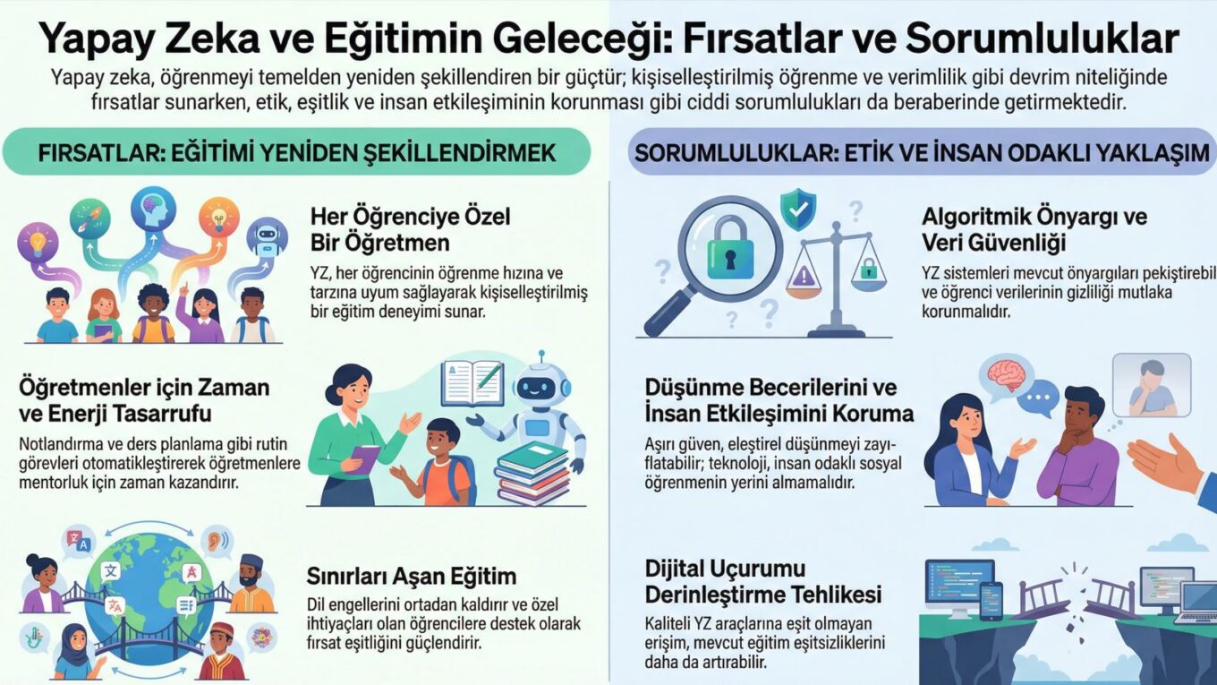 Okumaya devam etBu, kaynaklarınızda yer alan kapsamlı materyallere dayanan, eğitimde yapay zekânın (YZ) rolünü, fırsatlarını, etik sorumluluklarını ve gelecekteki pedagojik dönüşümleri ele